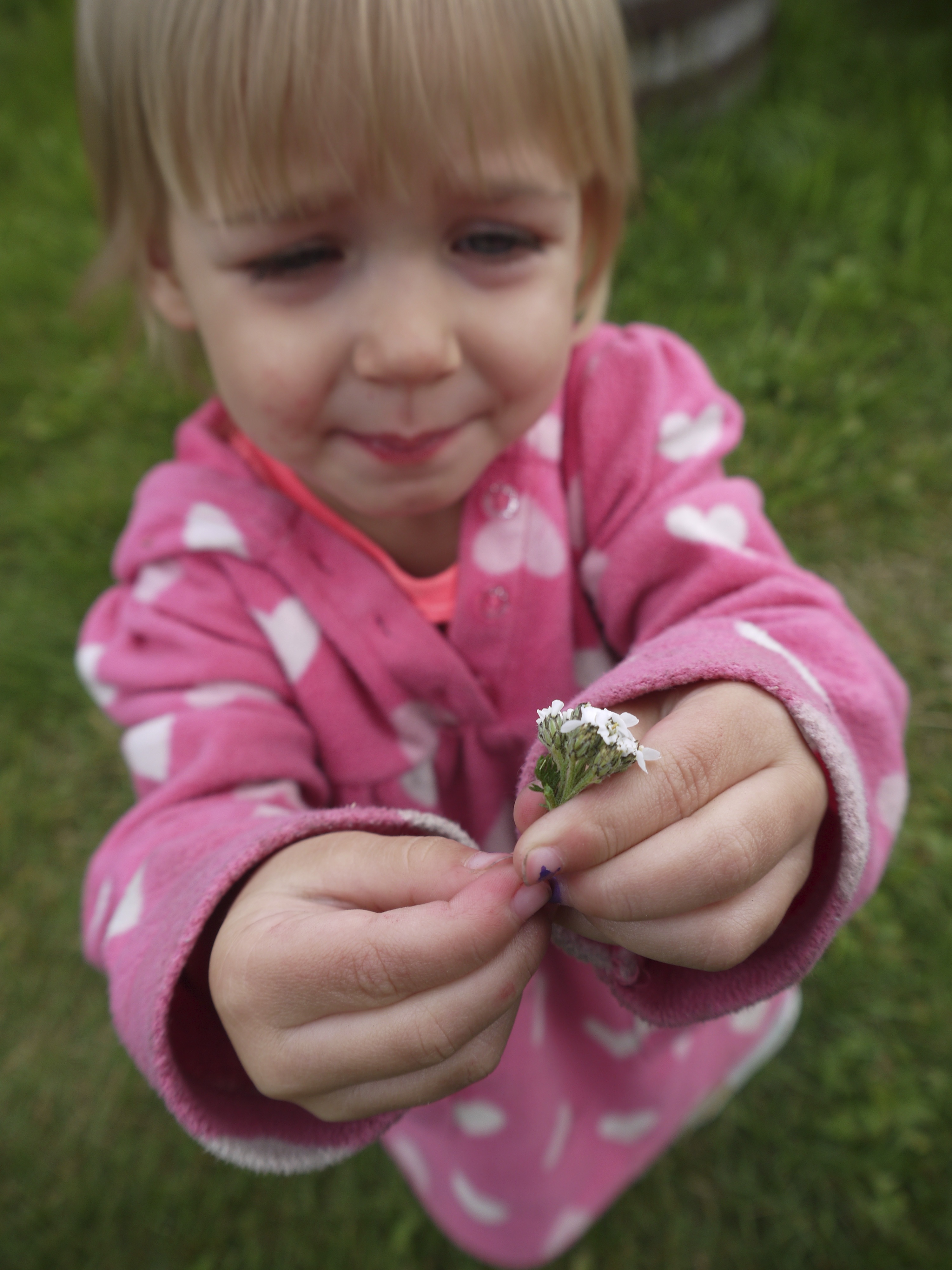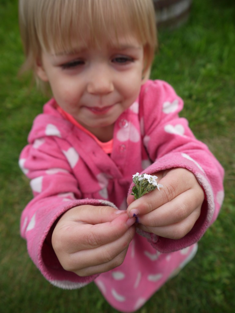 A few years ago we went out raspberry picking at a friend’s house. While there, I ended up following Sofia around the yard until she came across some yarrow. She tried to pick it but couldn’t, so I pulled some off the top of the stem and handed it to her. She inspected it, then broke it into three little bundles and handed them to me one at a time. Here Mama! Here Mama! Here Mama!